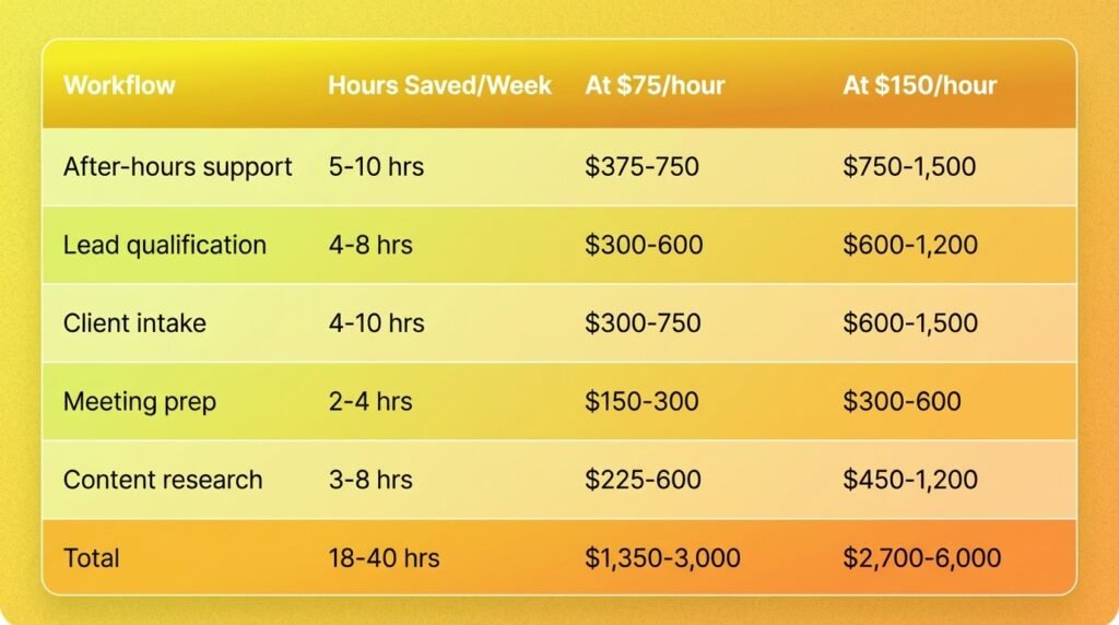 The fastest way to see ROI from AI is to automate workflows where the time savings immediately exceed the platform cost. These five workflows consistently pay for themselves within the first week for small businesses: after-hours customer support, lead qualification, new client intake, meeting preparation, and content research. Each one saves 2 to 8 hours per week, making a $20-25/month platform investment profitable from day one.