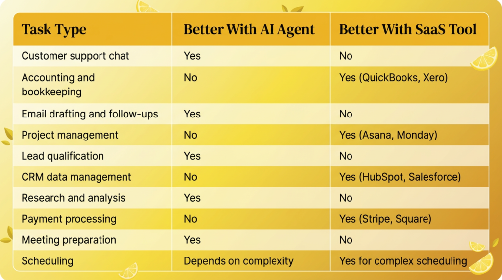 Question 1: Is the core job language-based? If the tool mainly helps you write, respond to, or understand text, an AI agent probably does it better. If it manages structured data, transactions, or integrations, keep the SaaS tool.