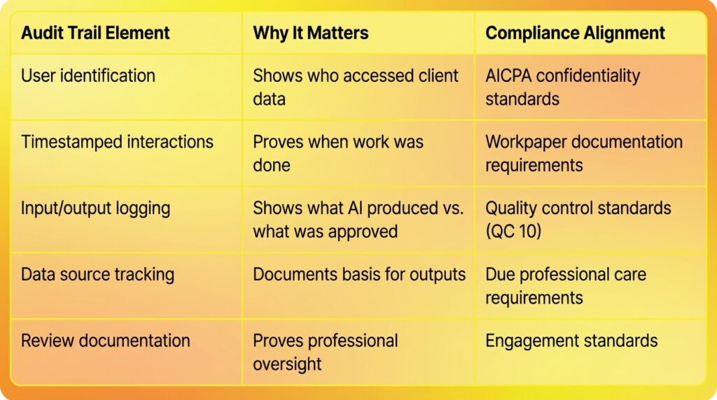 The same professional standards apply as with any tool. The CPA who signs the work is responsible for its accuracy. This is why every AI workflow should include a professional review step. A governed platform’s audit trail also documents who reviewed the output, creating a clear chain of responsibility.