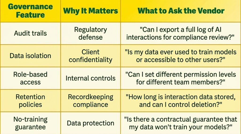 Financial advisors should require five specific governance features before deploying any AI tool that touches client data: audit trails, data isolation, role-based access, retention policies, and a no-training guarantee.