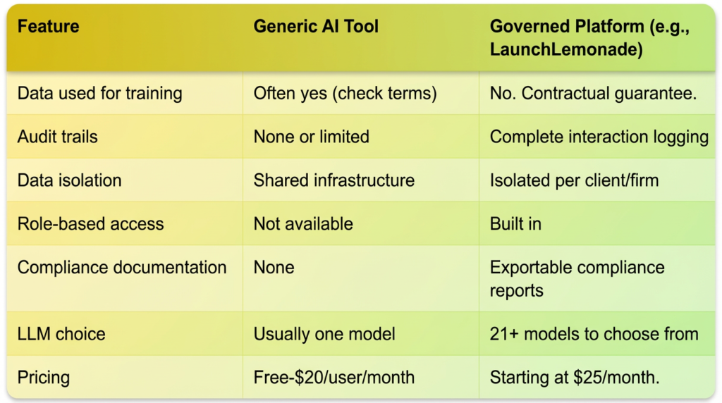Financial advisors can use AI assistants for client communication drafts, meeting prep, research summaries, and operational tasks without violating compliance requirements, but only on platforms with built-in governance. The key requirements: audit trails for every interaction, data isolation (your client data never trains the model), role-based access controls, and a clear compliance paper trail. Governed platforms like LaunchLemonade are built specifically for businesses that can’t afford to get it wrong. This guide covers what’s allowed, what’s risky, and how to start safely.