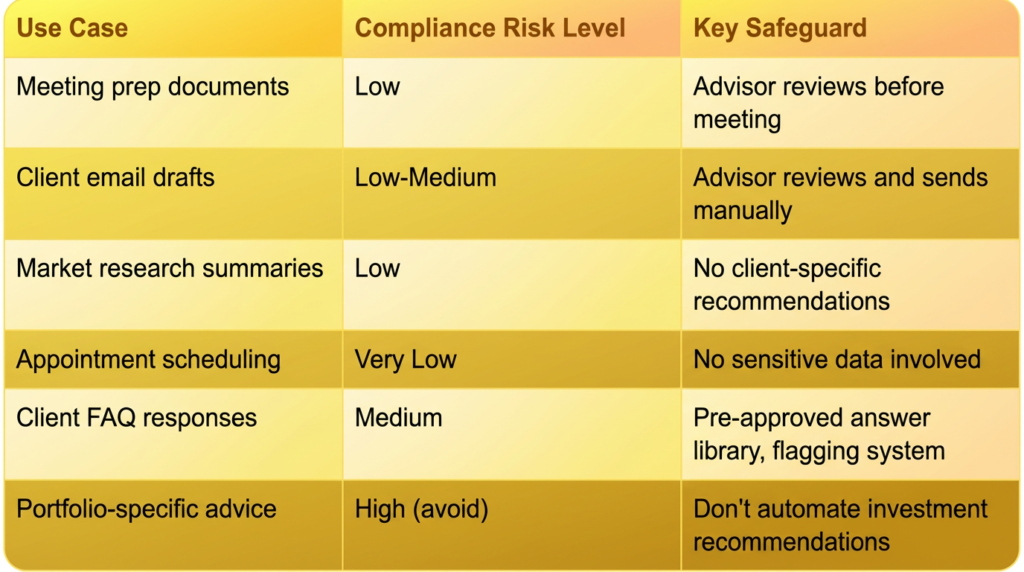 The safest AI use cases for financial advisors are tasks where the assistant handles preparation and the advisor handles judgment. Here are the specific workflows that stay well within compliance boundaries:
