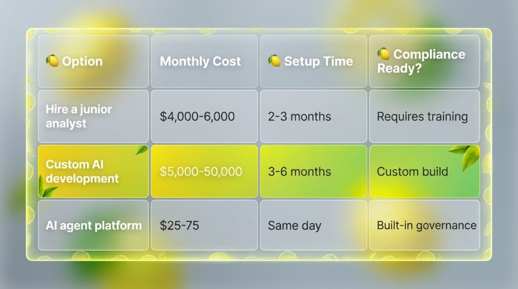 | Hire a junior analyst | $4,000-6,000 | 2-3 months | Requires training |