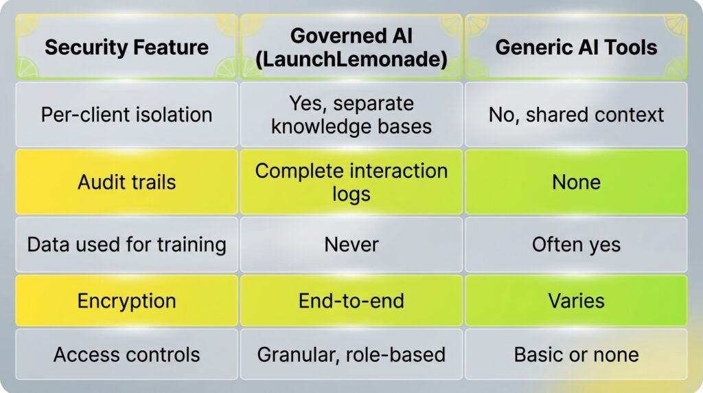 Governed AI platforms like LaunchLemonade solve this with per-client data isolation. Each client gets their own agent with its own knowledge base. The agent working on Company A’s financials has zero access to Company B’s data.