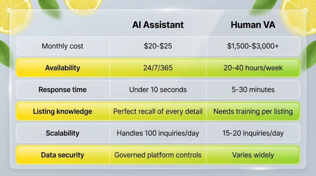 AI assistants for real estate typically cost $20-$25 per month, while a human virtual assistant costs $1,500-$3,000+ per month for comparable availability.