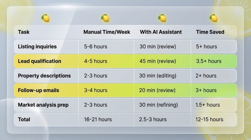 A real estate agent managing 15-20 active clients can realistically save 12-15 hours per week by automating inquiry responses, lead qualification, property descriptions, follow-ups, and market prep.