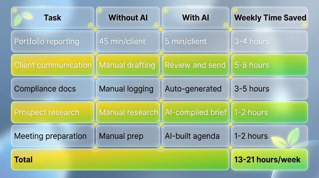 AI for wealth management automates portfolio reporting, client communication, compliance documentation, prospect research, and meeting preparation – giving advisors back 10-15 hours per week to focus on relationship building and strategic planning.