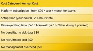 - AI requires minimal management: 15-30 minutes of initial setup, then 5-10 minutes per task for review and feedback. A human employee requires 2-4 hours per week of management time (check-ins, feedback, training, task assignment). AI has no onboarding period, no performance reviews, and no turnover risk.