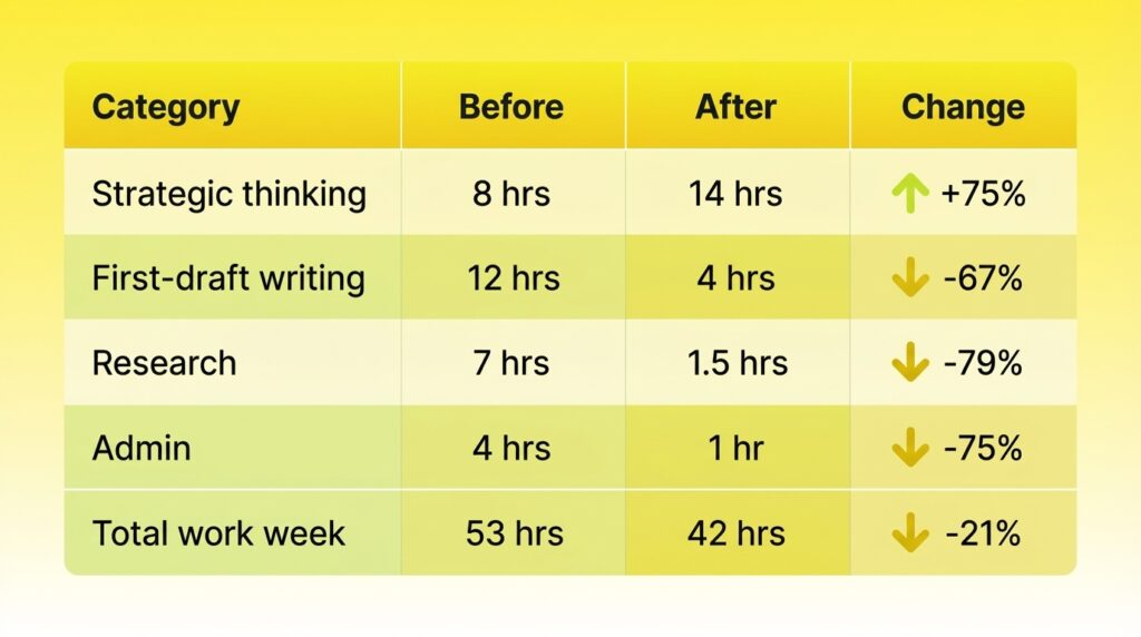 I work 11 fewer hours per week. My strategic thinking time nearly doubled. The quality of my output improved because I spend more time on the work that actually matters.