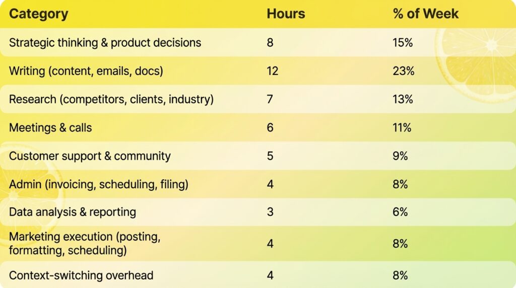 58% of my week. That’s 31 hours of work that doesn’t require my specific expertise. At even a modest $100/hour valuation, that’s $3,100/week in misallocated time.