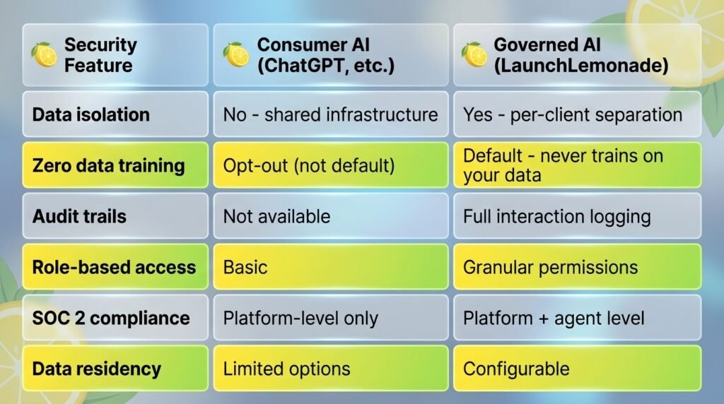 Consumer AI tools are designed for general use. They optimize for capability and convenience, not for the security requirements of professional services. Enterprise and governed AI platforms like LaunchLemonade are built specifically for businesses that handle sensitive data.