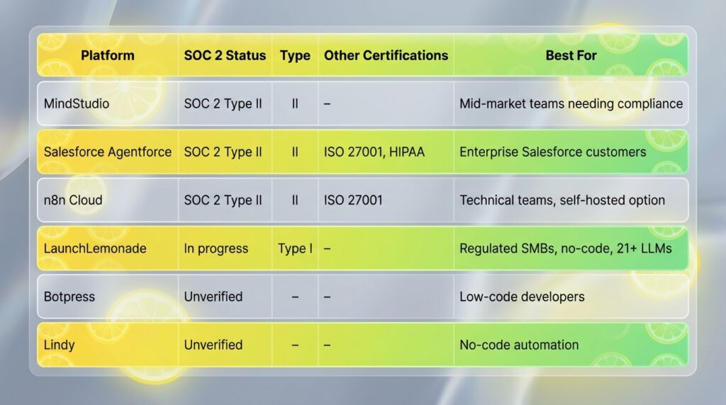 A note on LaunchLemonade’s status: We’re pursuing SOC 2 Type I certification, targeted for completion in H1 2026 I’m being transparent about this because honest numbers matter more than impressive claims. Our platform includes encryption, audit trails, and access controls today. The SOC 2 certification is the independent verification that our controls meet the standard.