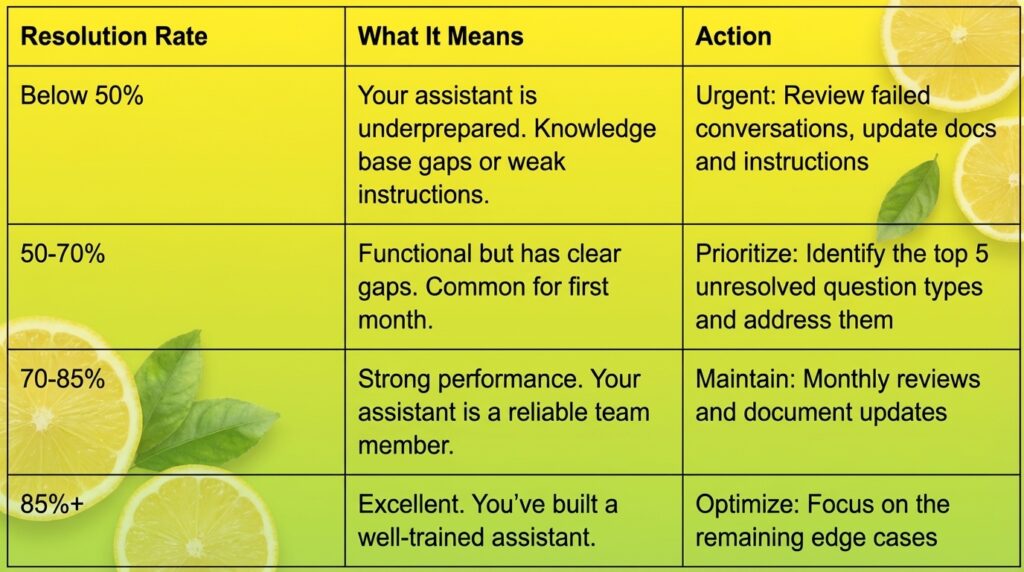 Resolution Rate What It Means Action Below 50% Your assistant is underprepared. Knowledge base gaps or weak instructions. Urgent: Review failed conversations, update docs and instructions 50-70% Functional but has clear gaps. Common for first month. Prioritize: Identify the top 5 unresolved question types and address them 70-85% Strong performance. Your assistant is a reliable team member. Maintain: Monthly reviews and document updates 85%+ Excellent. You’ve built a well-trained assistant. Optimize: Focus on the remaining edge cases