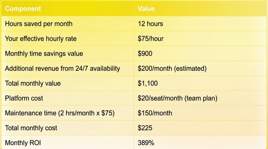 Component Value Hours saved per month 12 hours Your effective hourly rate $75/hour Monthly time savings value $900 Additional revenue from 24/7 availability $200/month (estimated) Total monthly value $1,100 Platform cost $20/seat/month (team plan) Maintenance time (2 hrs/month x $75) $150/month Total monthly cost $225 Monthly ROI 389%