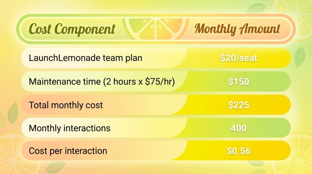 Cost Component Monthly Amount LaunchLemonade team plan $20/seat Maintenance time (2 hours x $75/hr) $150 Total monthly cost $225 Monthly interactions 400 Cost per interaction $0.56