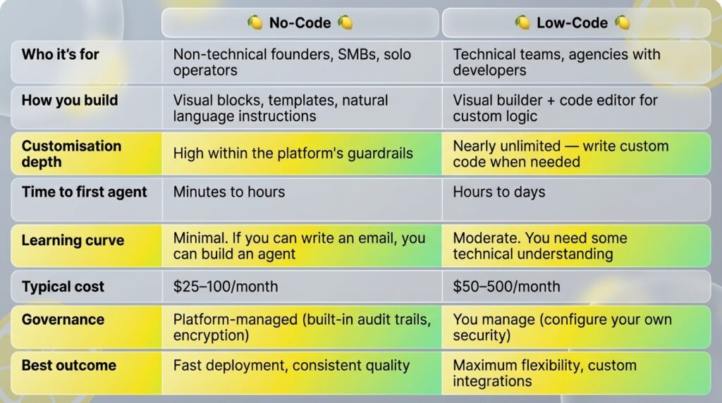 No-code platforms typically range from $25–100/month for SMBs, while low-code platforms range from $50–500/month, but the real cost difference is labour. No-code agents are built and maintained by the business owner, while low-code agents need developer time at $50–200+/hour. Factor in both platform cost and people cost when comparing.