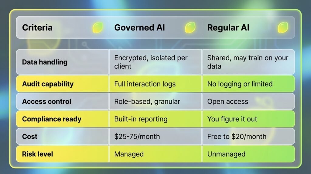 A: Governed AI platforms like LaunchLemonade run $25-75/month versus free-to-$20 for consumer tools. But the cost of a compliance violation, client data breach, or failed audit is orders of magnitude higher. Think of governance as insurance, not overhead.
