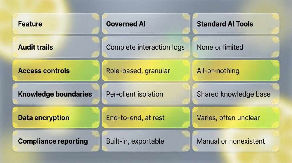 Governed AI platforms like LaunchLemonade wrap that same intelligence in a compliance layer. You get the same AI capabilities, but with controls that make the technology safe for regulated work.